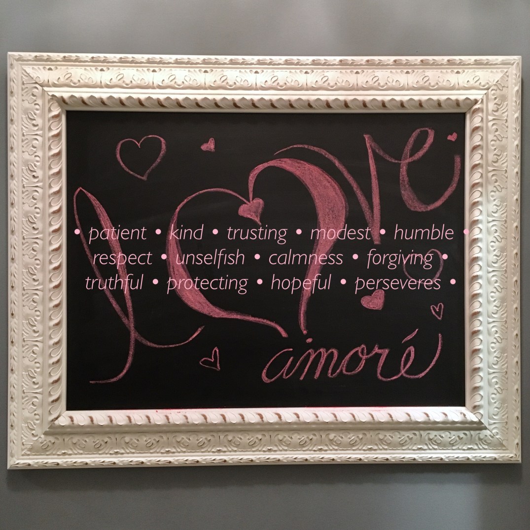 Getting back to the subject of love, while I was reading the passages for homework, one referenced passage was: 1 Corinthians; which happens to be the book with the script read frequently in weddings, many of us have heard it before, beginning: “Love is patient, love is kind…” (1 Corinthians 13: 4-8) and something clicked with me the next day after reading that, and I decided to summarize this passage with one word for each thought from this passage as a text overlay, adding it to a photo I took of my seasonal chalkboard message (the main photo).  This photo now serves a quick reminder or checklist to go back to at any time:  i.e. Are we showing love to others?  Are we in a loving relationship? Many people question our relationships at different times, i.e. what’s the status, how we are treated, or how we are treating others, so this summary is a good basis to evaluate love in a relationship.